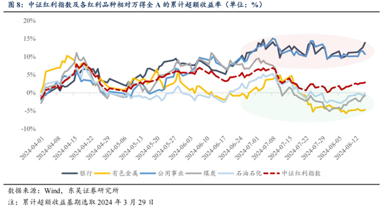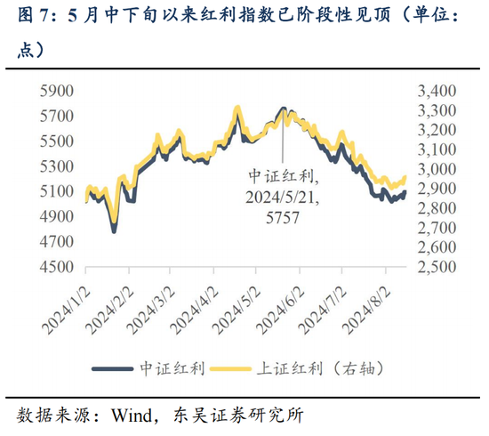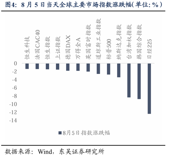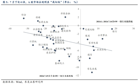 但高度共识的行情往往是脆弱的,7月美国非农数据发布触发萨姆法则点燃衰退恐慌,联储降息预期升温、日央行超预期加息15BP后,日元套息交易逆转、市场进入高波动状态。8月5日,亚太市场重挫,日、韩股市盘中均触发熔断机制,夜盘美股三大指数大幅收跌,科技巨头回调,VIX指数一度飙升至65%。而A股核心红利资产也开启补跌,行业层面出现明显高切低。可以预见,随着积极因素的积累,市场对于资产价格底部承压的一致预期面临瓦解,全球已经逐步进入到一个波动率上行的阶段,全球资产的高低切换有望出现(高估值美股切换至低估值A股/港股)。
