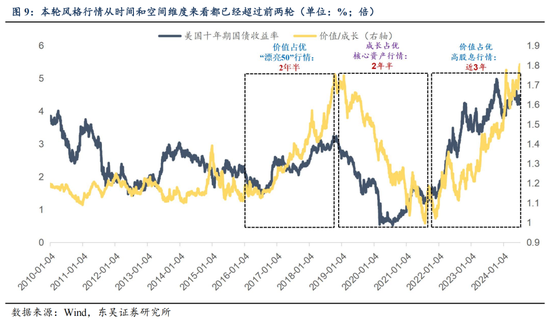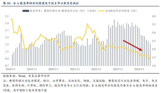 红利风格方面,我们在3月17日的报告《再论红利和成长》中分析,红利股票交易的是阶段性十年期国债变动幅度的斜率与该斜率的未来预期,对应到经济预期层面,若投资人对于经济基本面趋势因素的消化已较为充分,则红利溢价提升可能较为有限。在3月中旬我们即判断,中短期内利率进一步下行的空间相对有限,红利风格溢价提升空间可能已经不大。6月16日《科技股的春天》报告再从大级别风格行情轮动的角度讨论了本轮价值风格占优在时间和空间维度均已超越历史经验。时间维度上,当前价值占优的持续时间接近3年,显著超过了前两轮,16-19年“漂亮50”行情和19-21年核心资产行情均持续约2年半。空间维度上,全A股息率的分化程度已达到了历史极低水平。