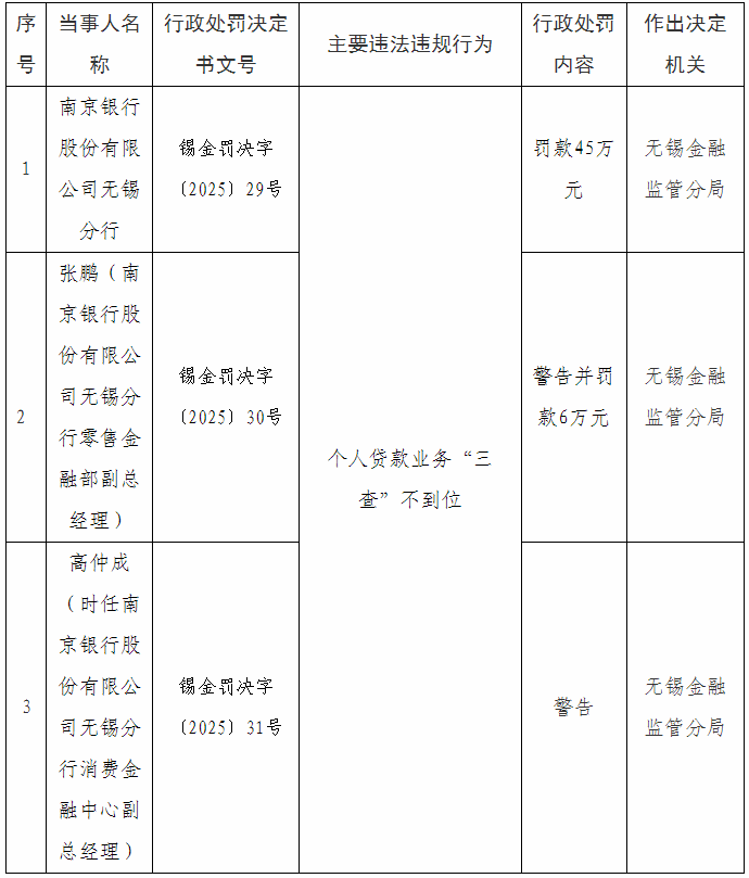 行政处罚信息公开表显示,因个人贷款业务“三查”不到位,南京银行无锡分行被无锡金融监管分局罚款45万元。