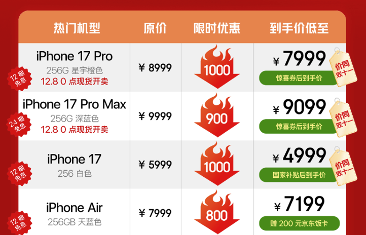 具体来看,256G版iPhone 17 Pro领300元惊喜券,以旧换新补贴700元起,到手价低至7999元;256G版iPhone 17 Pro Max领300元惊喜券,以旧换新补贴600元起,到手价低至9099元;256G版iPhone 17部分地区可领500元国家补贴,以旧换新补贴500元起,到手价4999元;iPhone Air 256G版下单送200元京东饭卡,以旧换新补贴800起,到手价7199元起。值的一提的是,以上手机支持至高24期免息,让大家都能轻松换新。